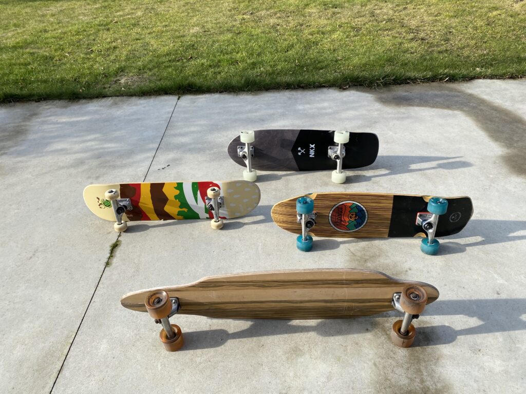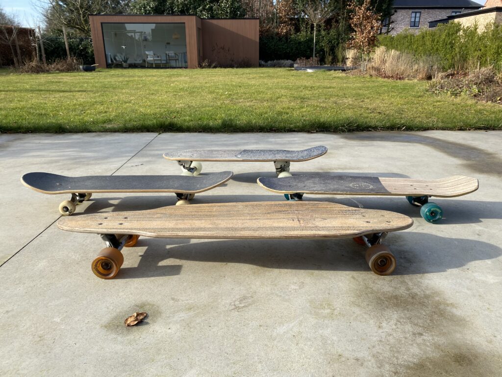 We hebben hier nog een aantal skateboards staan. Een kleiner board voor kinderen onder de 12 jaar, een long board en een surf skate om te oefenen op surfen.